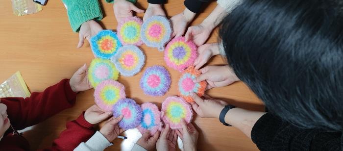 산타는직원들을 위해 정성껏 준비한 예쁜 수세미 선물을 살며시 놓고 갔습니다.