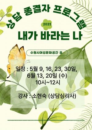 수원시여성문화공간휴 상담실에서는 개인상담을 마치신 분들이 일상에 잘 적응하고 스스로 부정적 정서를 잘 조절하며 살 수 있도록 돕는 사후관리 프로그램을 운영하고 있습니다. 개인상담 후 마무리까지 잘 이루어지는 시스템은 휴의 자랑입니다. 올해에는 ...