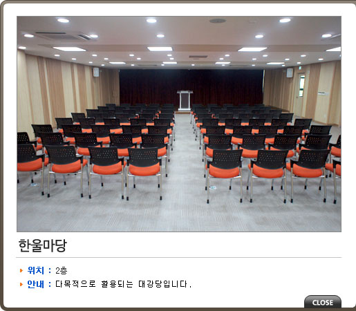 | 2층 | 대강당 | 한울마당 | 큰 또는 온 세상이라는 뜻으로, 넓은 땅을 가리키는 말 | |